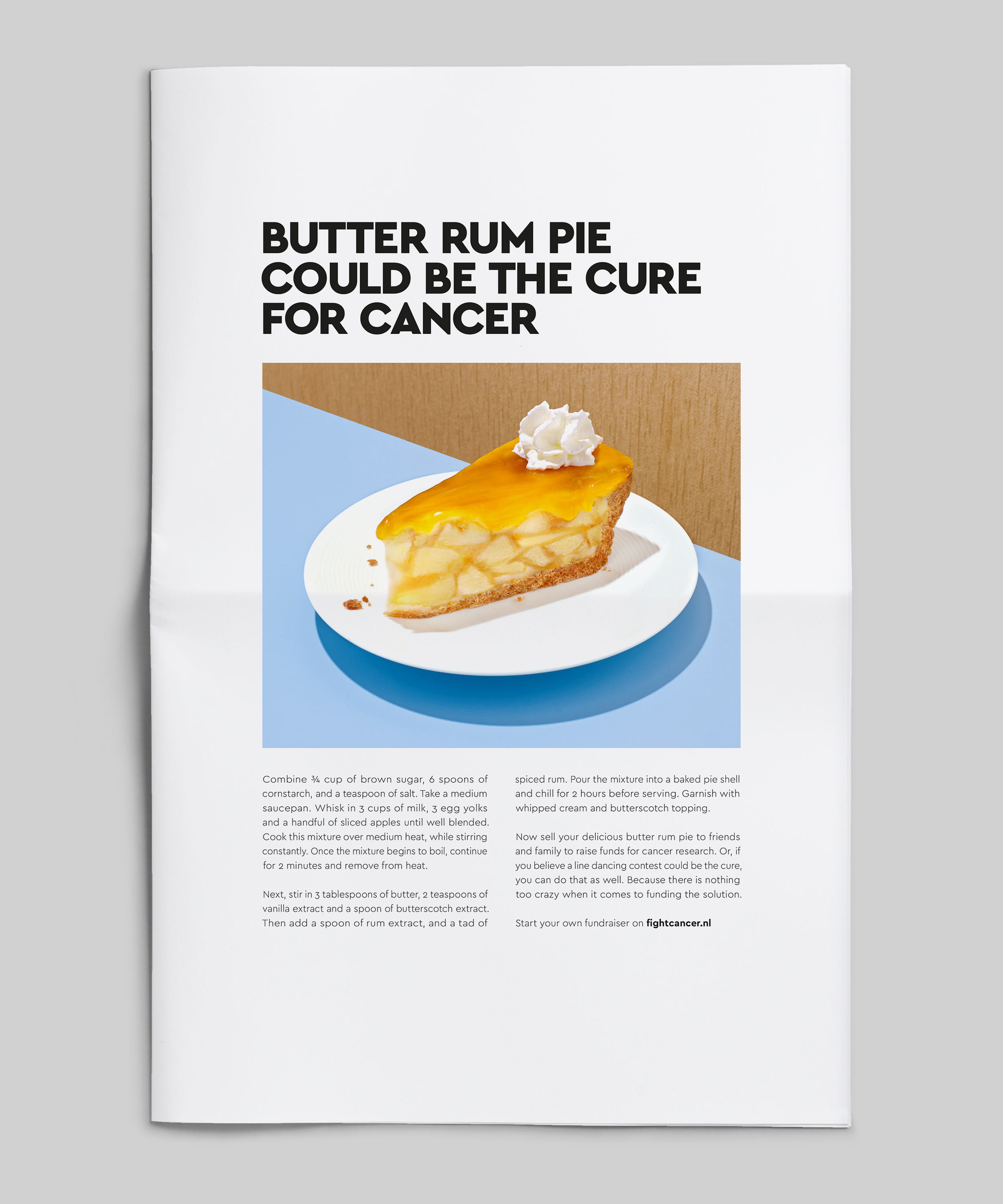 Butter rum pie could be the cure for cancer if you bake it, sell it, and donate the proceeds to research. This print ad for Fight Cancer shares the recipe, presented without a logo and styled like an editorial to draw readers in and make the message stick.